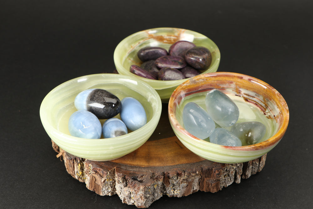 These cute little green onyx bowls make a great addition to any crystal décor. Use them to hold little tumbled stones, jewelry, or even put some black sand in it to use as an incense burner.