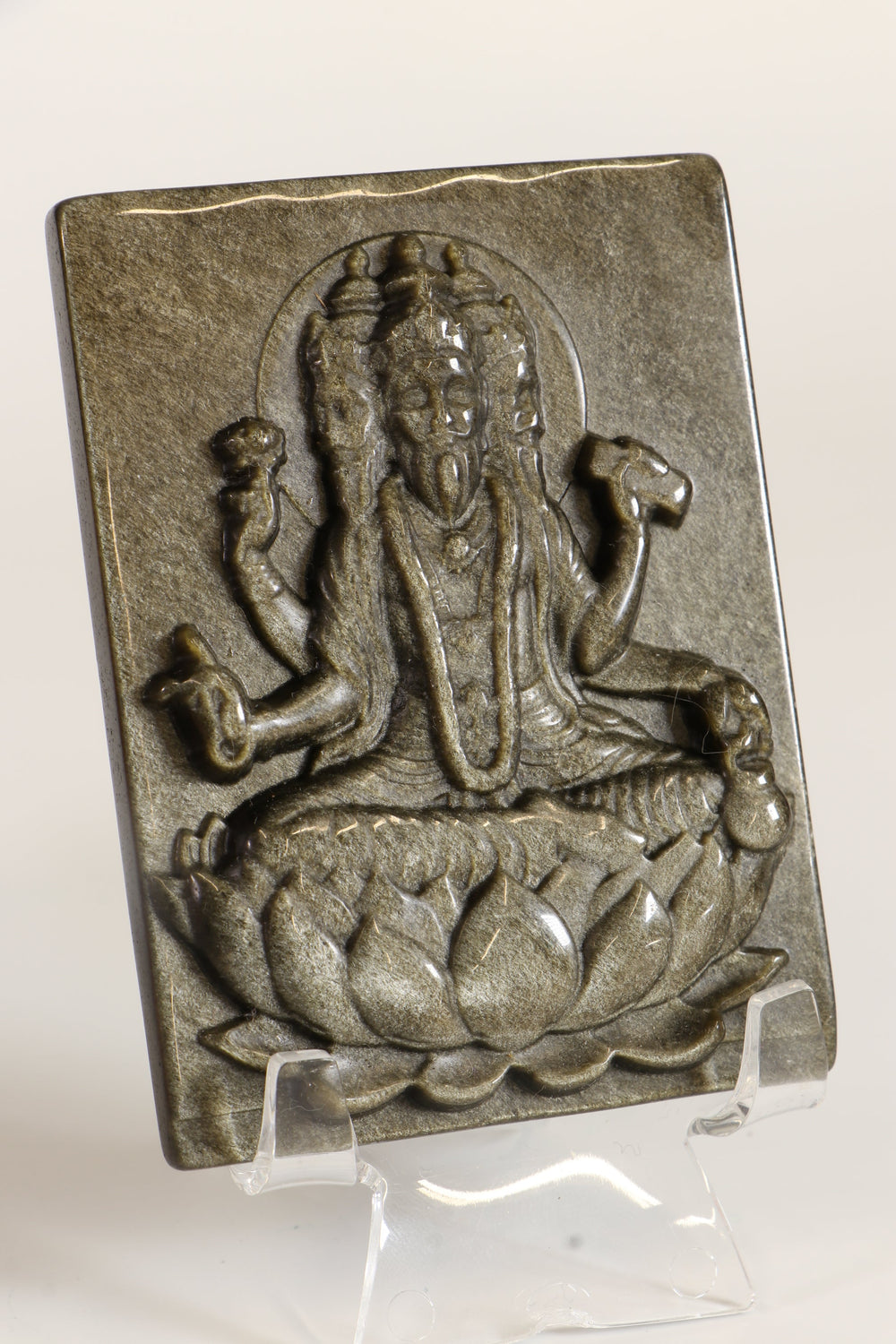 Brahma is the Creator within the Trimurti, which is the trinity of supreme divinity that includes Vishnu and Shiva. Brahma was born from a golden egg and created the earth and all things on it. In later Hindu mythology, he is described as having come from a lotus that sprang from Vishnu's navel. He is usually depicted as having four faces, symbolic of the four-square capacity expressed in the four Vedas, the four yugas, four stages of life, and so on. He is typically shown with four arms, holding an alms bowl, a bow, prayer beads, and a book.