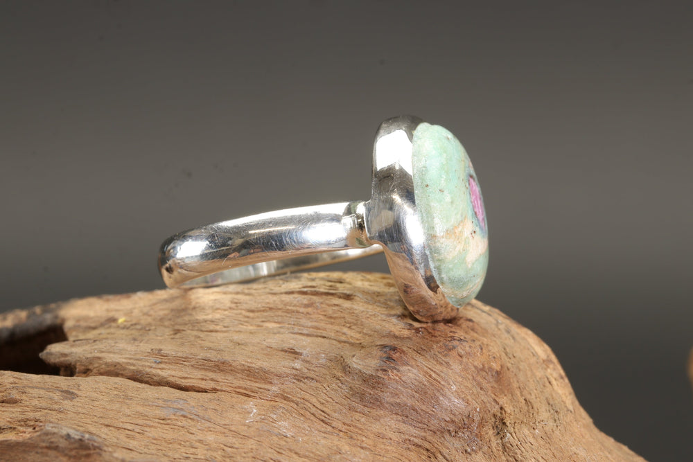 Ruby fuchsite is a lovely mineral combination featuring green fuchsite (a variety of muscovite mica) and red to pink ruby crystals. It is primarily found in regions such as Brazil, India, and Russia. Although the specific historical usage of ruby fuchsite is not extensively documented, both ruby and fuchsite individually hold historical significance. Ruby fuchsite exhibits a trichroic nature, displaying three different colors depending on the angle of observation. Composed of aluminum oxide and chromium, ruby contributes to the red coloration, while fuchsite, composed of aluminum, potassium, and chromium, imparts the green hues. The mineral has a hardness of around 6 on the Mohs scale. Its visually appealing combination of colors makes ruby fuchsite a sought-after material for collectors and jewelry enthusiasts.