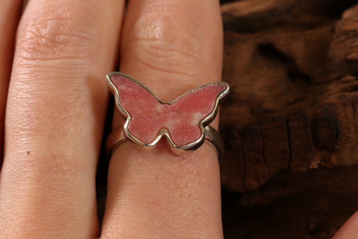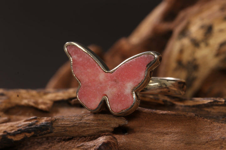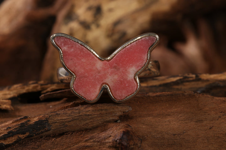 Thulite butterfly cabochon set in sterling silver. Size 8.