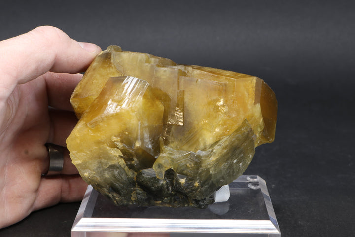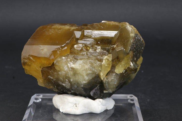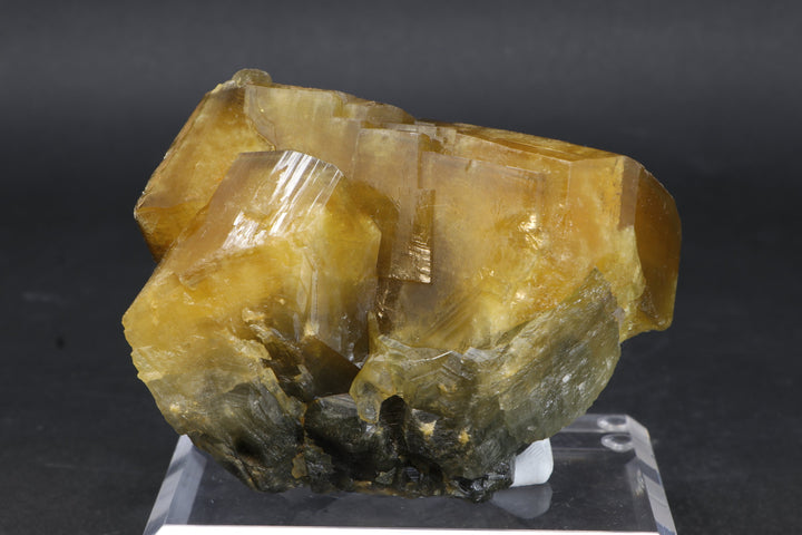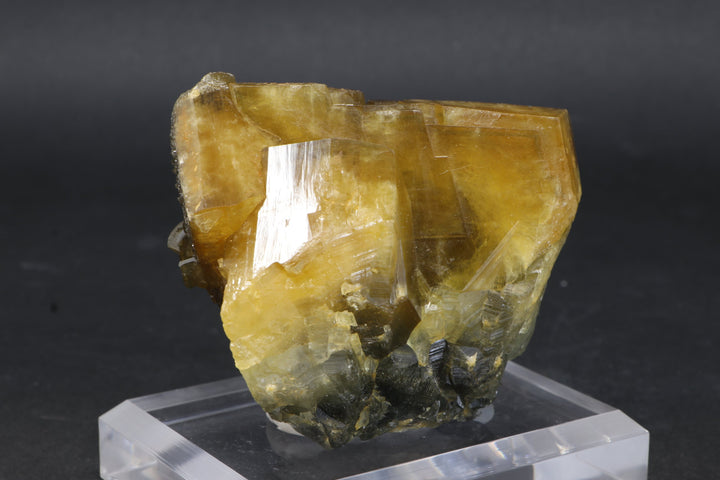 Deep, rich golden color and great luster on this barite specimen from Xiefang Mine. This is a small cluster with three terminations and a small pocket of druzy on one face.
