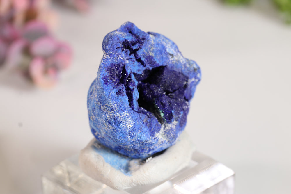 Azurite is a soft blue copper mineral that has been known since ancient times. It is one of two common basic copper carbonate minerals (the other being malachite). Azurite is typically found in the same geologic setting of copper ore deposits as malachite, but not quite as abundant.