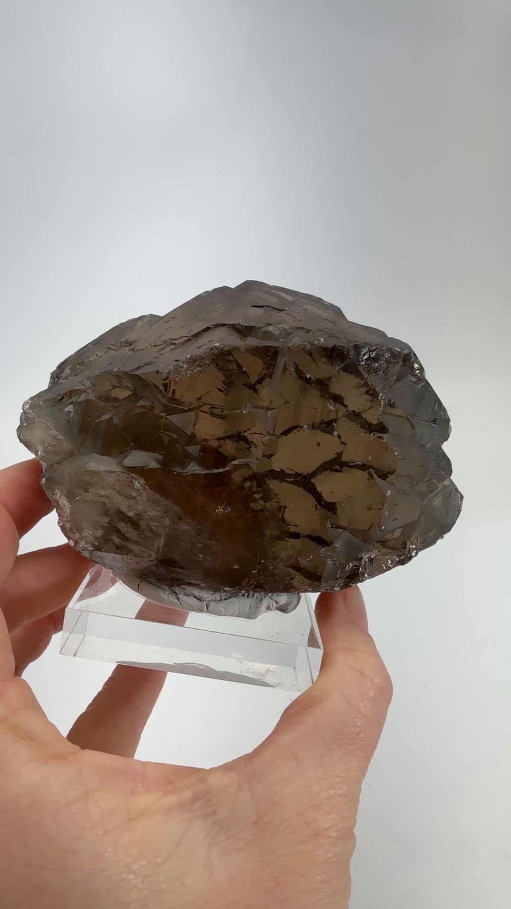 This gwindel from Mt. Blanc is a deep smoky color and has a very pronounced twist. It has nice luster and is in good condition with some contact damage on the bottom and bottom/back.