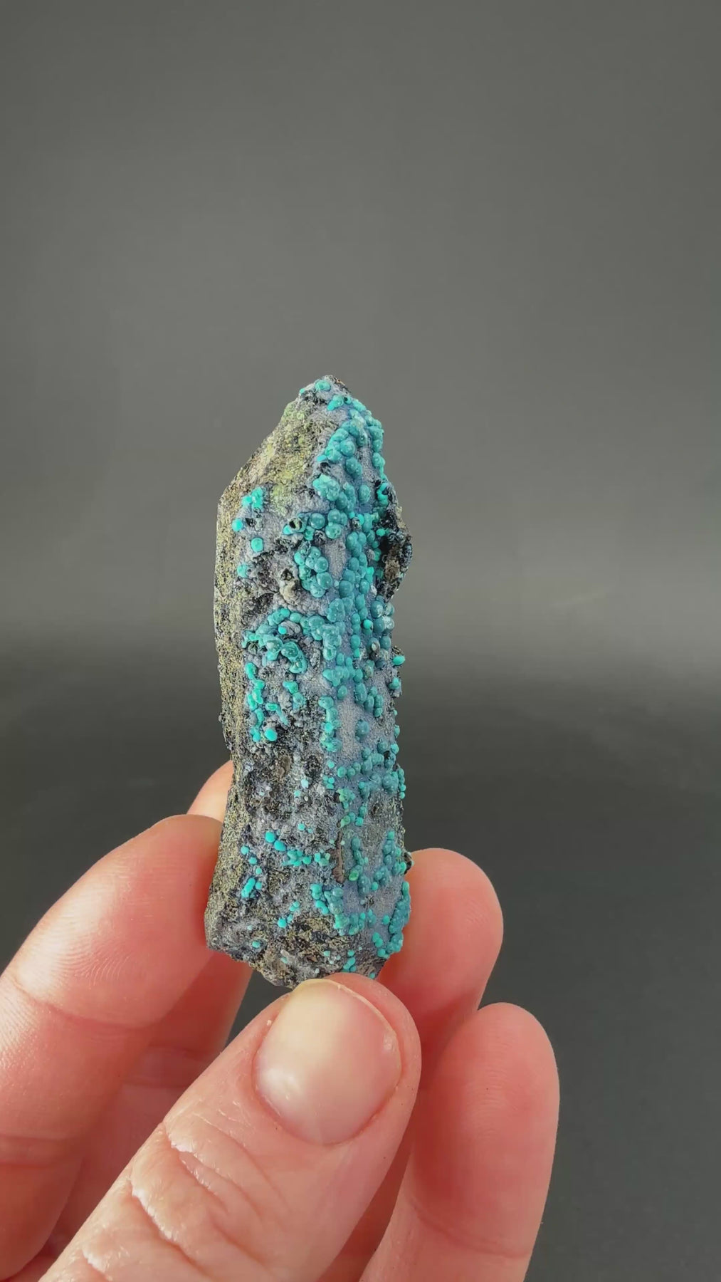 This specimen features a single, well-formed quartz point coated in botryoidal chrysocolla from the Tentadora Mine in Peru, a locality known for producing some of the finest quartz and copper-mineral combinations in the world. Chrysocolla is a hydrated copper silicate that forms in the oxidation zones of copper deposits and is prized for its natural blue and green hues. On quartz, it often develops in smooth, rounded “grape-like” formations that highlight the crystal’s shape rather than obscure it. Collectors seek these pieces for their clean crystal form, strong color contrast, and the rarity of intact single points with uniform chrysocolla coverage from this mine.