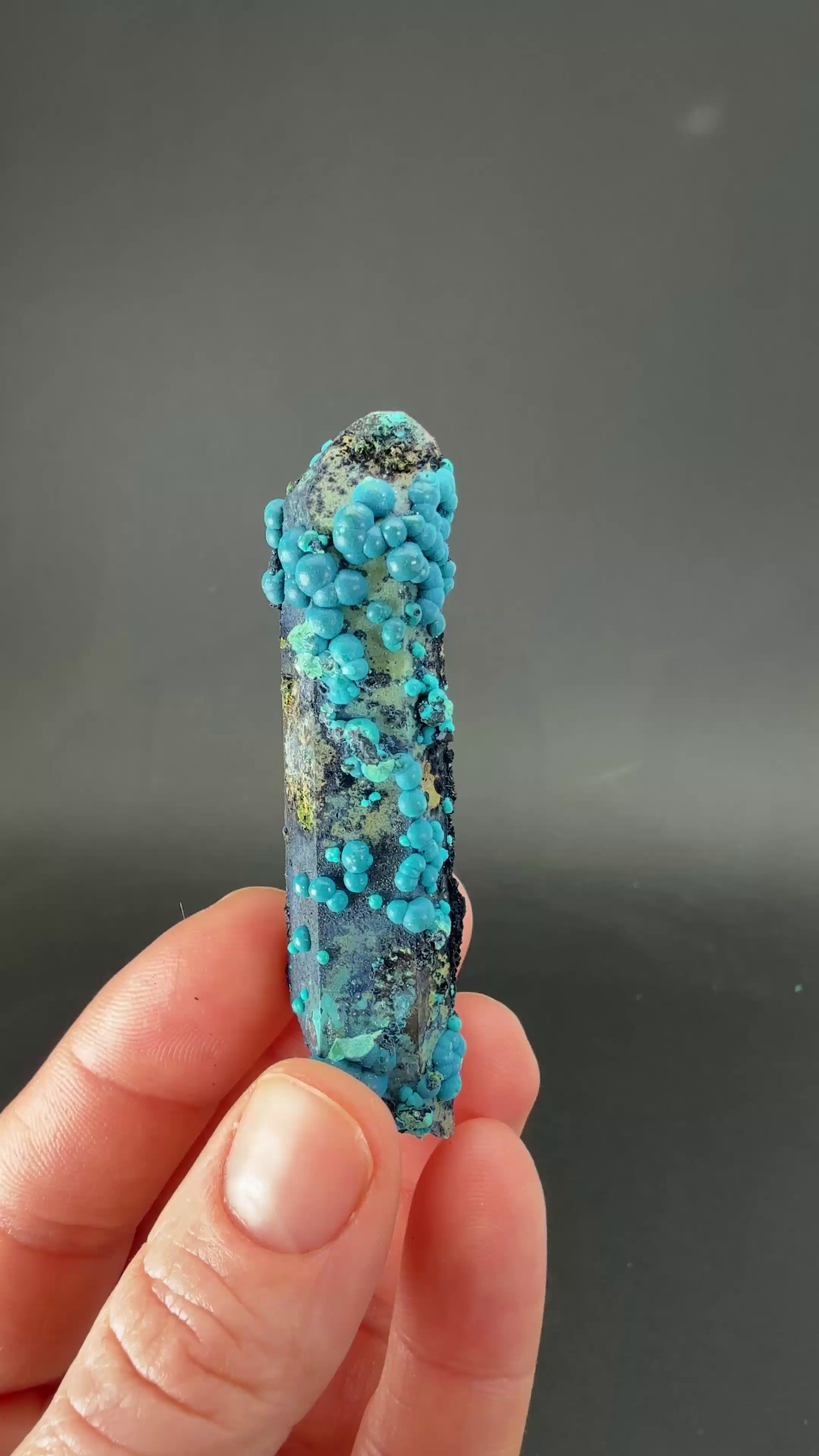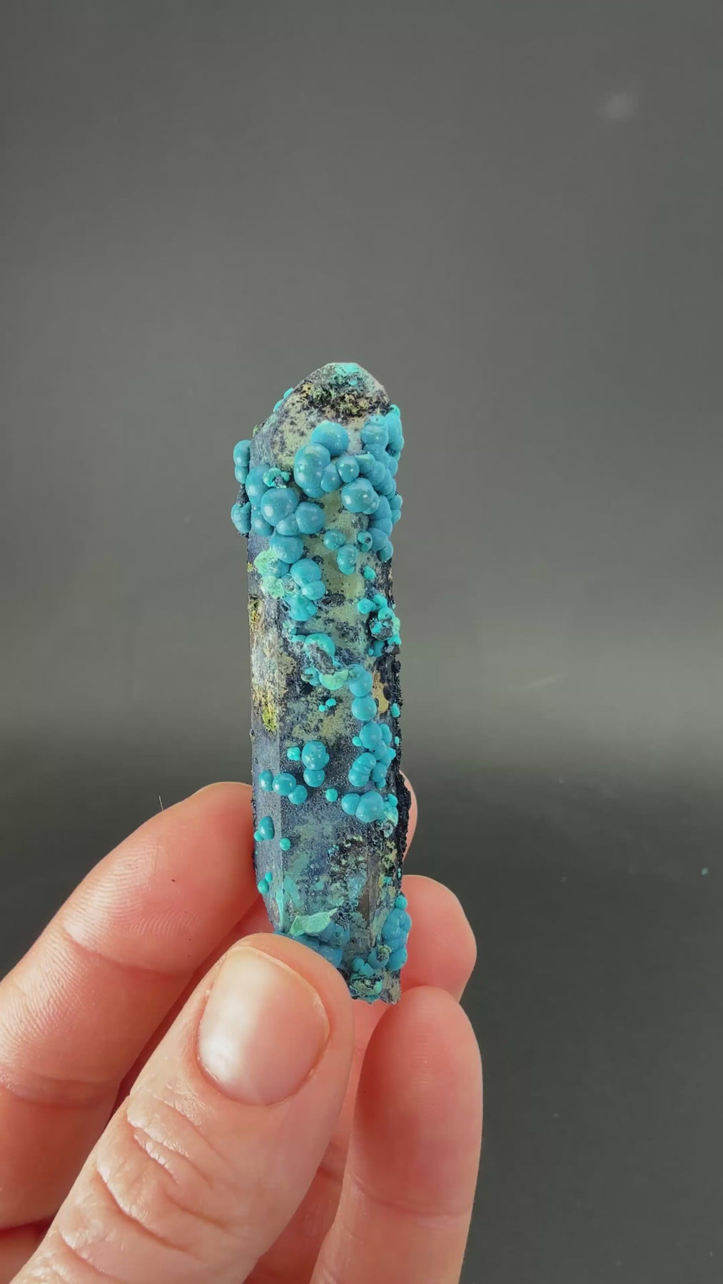 This specimen features a single, well-formed quartz point coated in botryoidal chrysocolla from the Tentadora Mine in Peru, a locality known for producing some of the finest quartz and copper-mineral combinations in the world. Chrysocolla is a hydrated copper silicate that forms in the oxidation zones of copper deposits and is prized for its natural blue and green hues. On quartz, it often develops in smooth, rounded “grape-like” formations that highlight the crystal’s shape rather than obscure it. Collectors seek these pieces for their clean crystal form, strong color contrast, and the rarity of intact single points with uniform chrysocolla coverage from this mine.