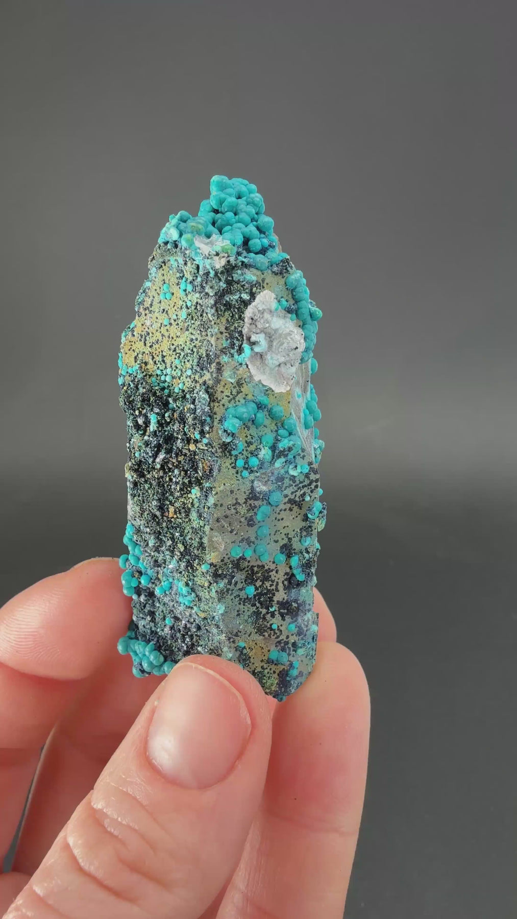 This specimen features a single, well-formed quartz point coated in botryoidal chrysocolla from the Tentadora Mine in Peru, a locality known for producing some of the finest quartz and copper-mineral combinations in the world. Chrysocolla is a hydrated copper silicate that forms in the oxidation zones of copper deposits and is prized for its natural blue and green hues. On quartz, it often develops in smooth, rounded “grape-like” formations that highlight the crystal’s shape rather than obscure it. Collectors seek these pieces for their clean crystal form, strong color contrast, and the rarity of intact single points with uniform chrysocolla coverage from this mine.