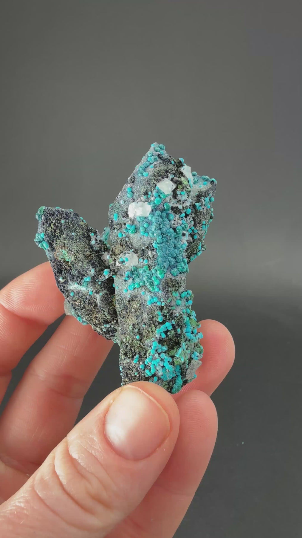 This specimen features a single, well-formed quartz point coated in botryoidal chrysocolla from the Tentadora Mine in Peru, a locality known for producing some of the finest quartz and copper-mineral combinations in the world. Chrysocolla is a hydrated copper silicate that forms in the oxidation zones of copper deposits and is prized for its natural blue and green hues. On quartz, it often develops in smooth, rounded “grape-like” formations that highlight the crystal’s shape rather than obscure it. Collectors seek these pieces for their clean crystal form, strong color contrast, and the rarity of intact single points with uniform chrysocolla coverage from this mine.