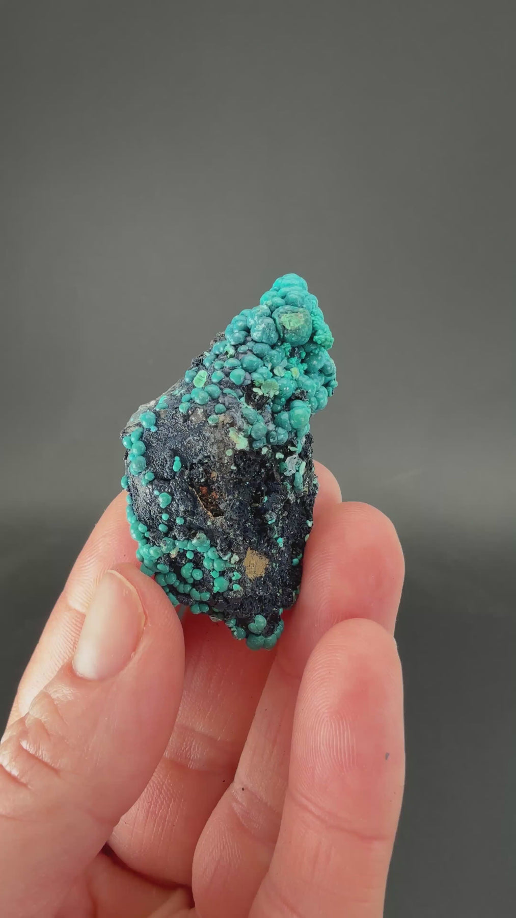 This specimen features a single, well-formed quartz point coated in botryoidal chrysocolla from the Tentadora Mine in Peru, a locality known for producing some of the finest quartz and copper-mineral combinations in the world. Chrysocolla is a hydrated copper silicate that forms in the oxidation zones of copper deposits and is prized for its natural blue and green hues. On quartz, it often develops in smooth, rounded “grape-like” formations that highlight the crystal’s shape rather than obscure it. Collectors seek these pieces for their clean crystal form, strong color contrast, and the rarity of intact single points with uniform chrysocolla coverage from this mine.