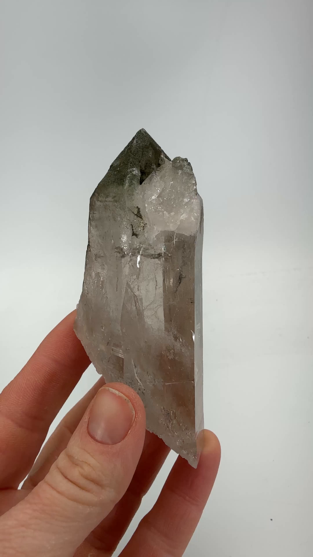 This lovely little point from Tessin, Switzerland features a coating of green chlorite on the termination, and a fully healed bottom where the crystal broke off its host at some point during its formation.