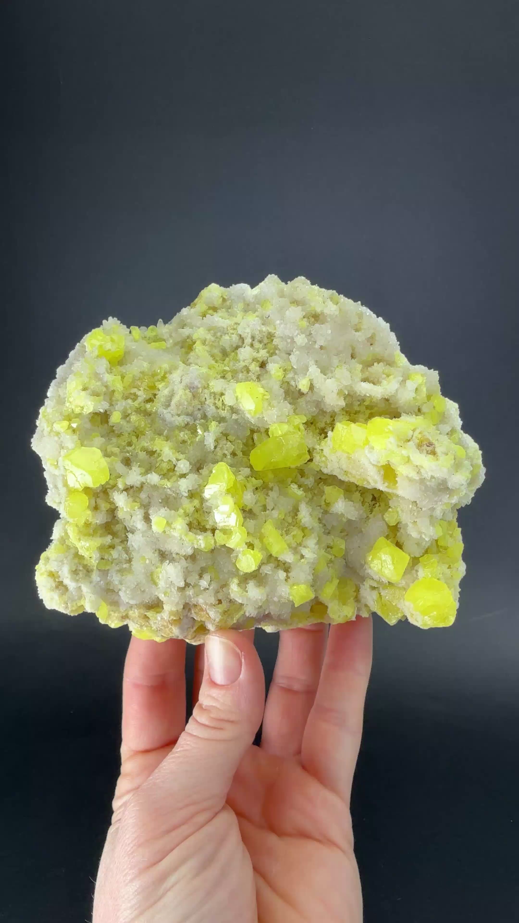 This large aragonite specimen features several well-formed sulfur crystals scattered throughout. This piece is from the Cozzo Disi Mine in Sicily, Italy.