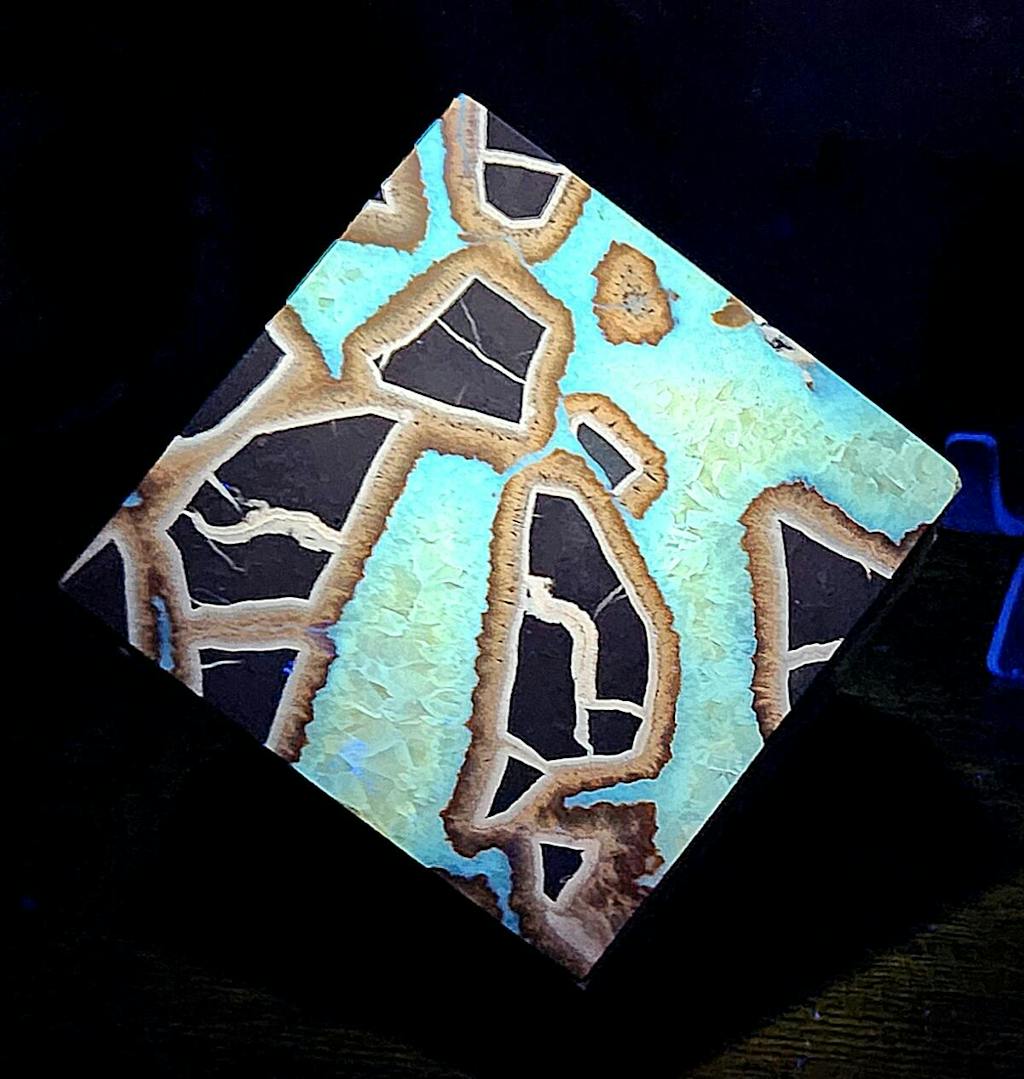 I love the colors and design of this amazing geode! It has a gorgeous green with blue tinged glow under uv lighting, but wasn't expecting it to be so beautiful in regular light! Arrived quickly and safely packaged, everything from this store has been of the highest quality! So highly recommend!