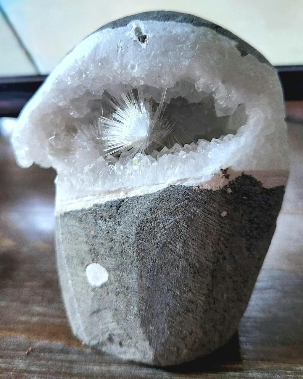 The only way to describe this mindblowing specimen is an icy comet about to explode in a cavern filled with crystals! So well protected in shipping that every bit of that crystalline structure is perfectly intact! I am so impressed with the high vibrations and beauty of this incredible geode!!!